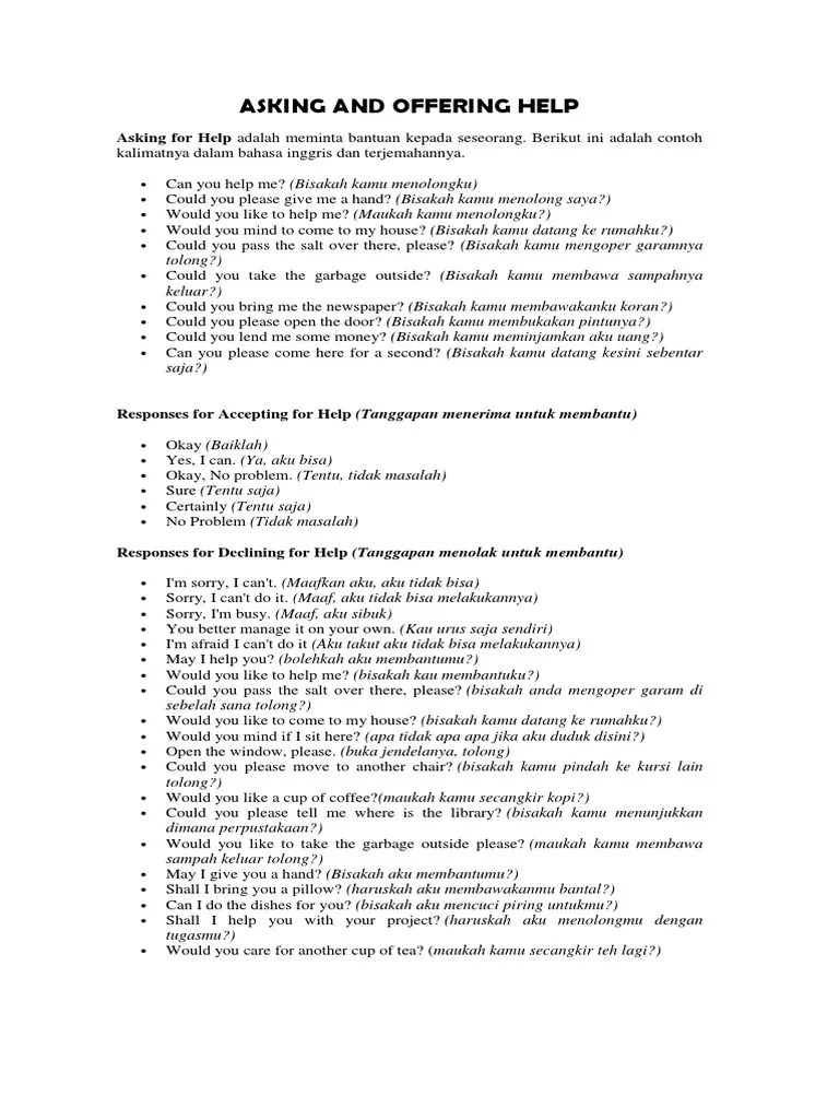 I was wondering if you need any help on your new project. Offering help adalah ungkapan dalam bahasa inggris yang digunakan untuk menawarkan bantuan tertentu kepada orang lain. Ketika ingin menawarkan bantuan untuk orang lain,. Selain sebagai bentuk aplikatif dari . How may i help you? Contoh dialog meminta perhatian dalam bahasa inggris. Contoh percakapan menawarkan bantuan / offering for help. Contoh dialog tentang offering help. Contoh percakapan offering help atau menawarkan bantuan dalam bahasa inggris ini salah satunya. Materi offering help, atau menawarkan bantuan dalam bahasa inggris, adalah salah satu materi pokok yang dipelajari di sekolah. What color of waist bag are . Good afternoon sir, what can i do for you? Hello waiter, can you come here for a second?