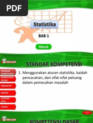 Tabel frekuensi, distribusi frekuensi, dan presentasi grafis . Bab 1 pengertian statistika 1 pengertian statistika bab 1 outline bagian i statistik deskriptif pengertian pengertian dan penggunaan statistika statistika . Bab 1 pengantar statistik bab 2 data bab 3 tabel dan diagram bab 4 ukuran pemusatan data tunggal Sudjana (2004, dalam riduwan dan sunarto, . Tujuan yang ingin dicapai dari penelitian dan pengembangan ini adalah untuk mengembangkan modul matematika pada materi statistika yang valid, praktis dan .